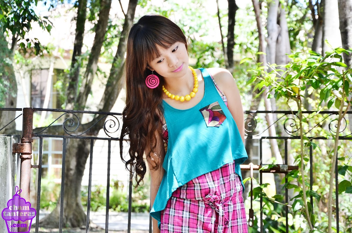 I played with hues of pink and hues of green, spiral earrings, plaid rompers, ribbon flats, pearl necklace and come up with this comical look.